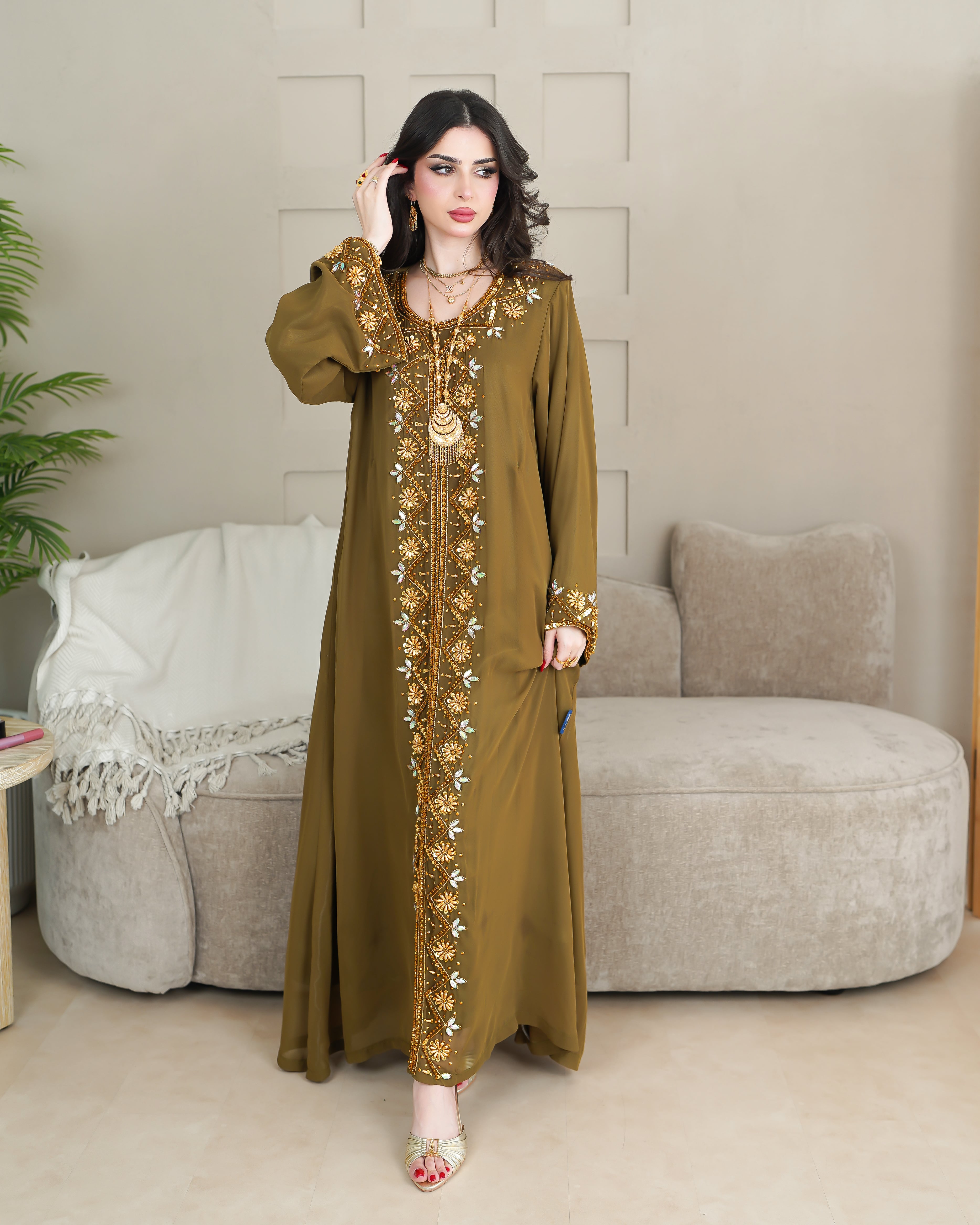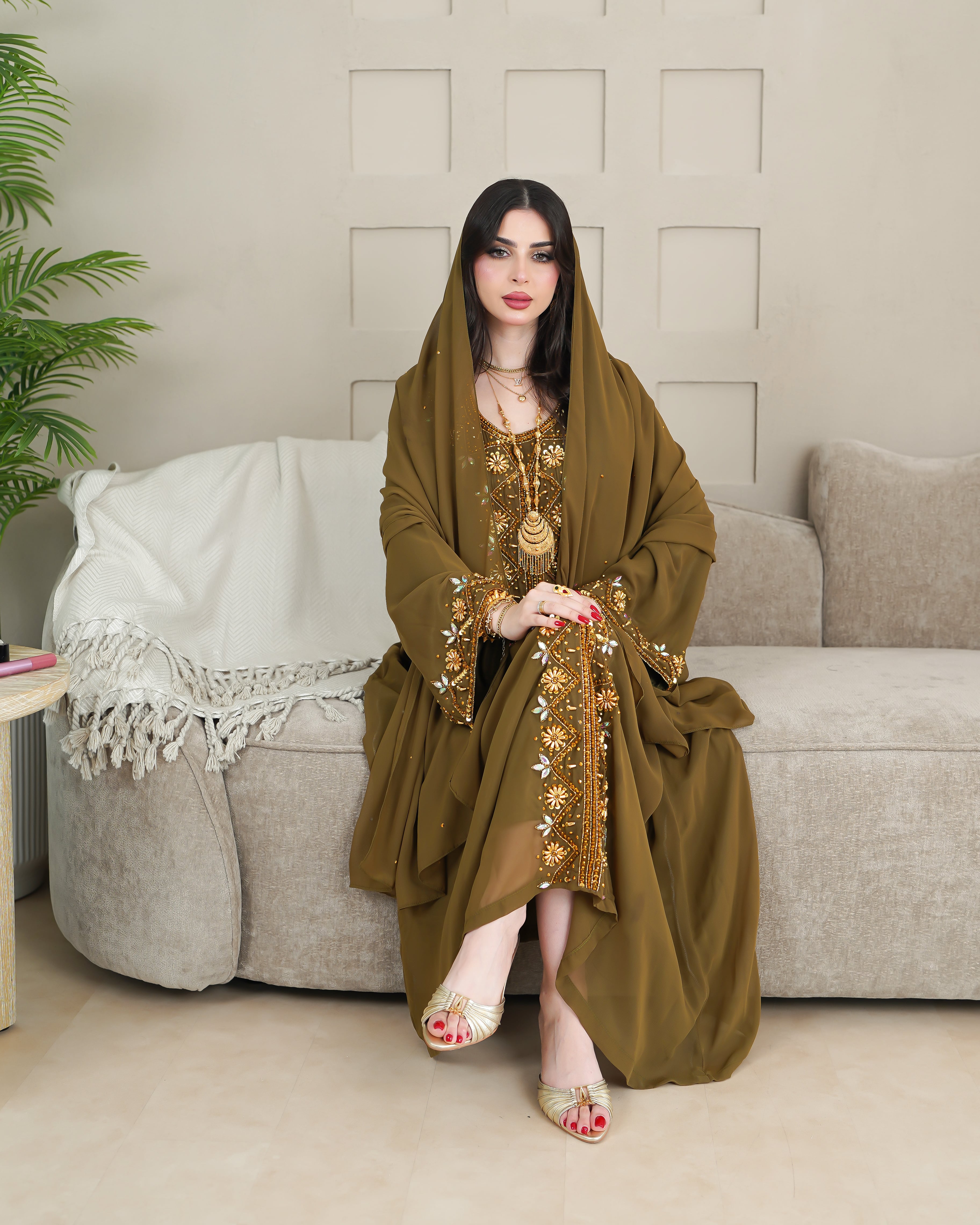 نوع القماش:شيفون شامل الشيلة: نعم ملاحظة: العارضة ترتدي الطول 51 الصدر 28 الكم من نص الرقبة 27