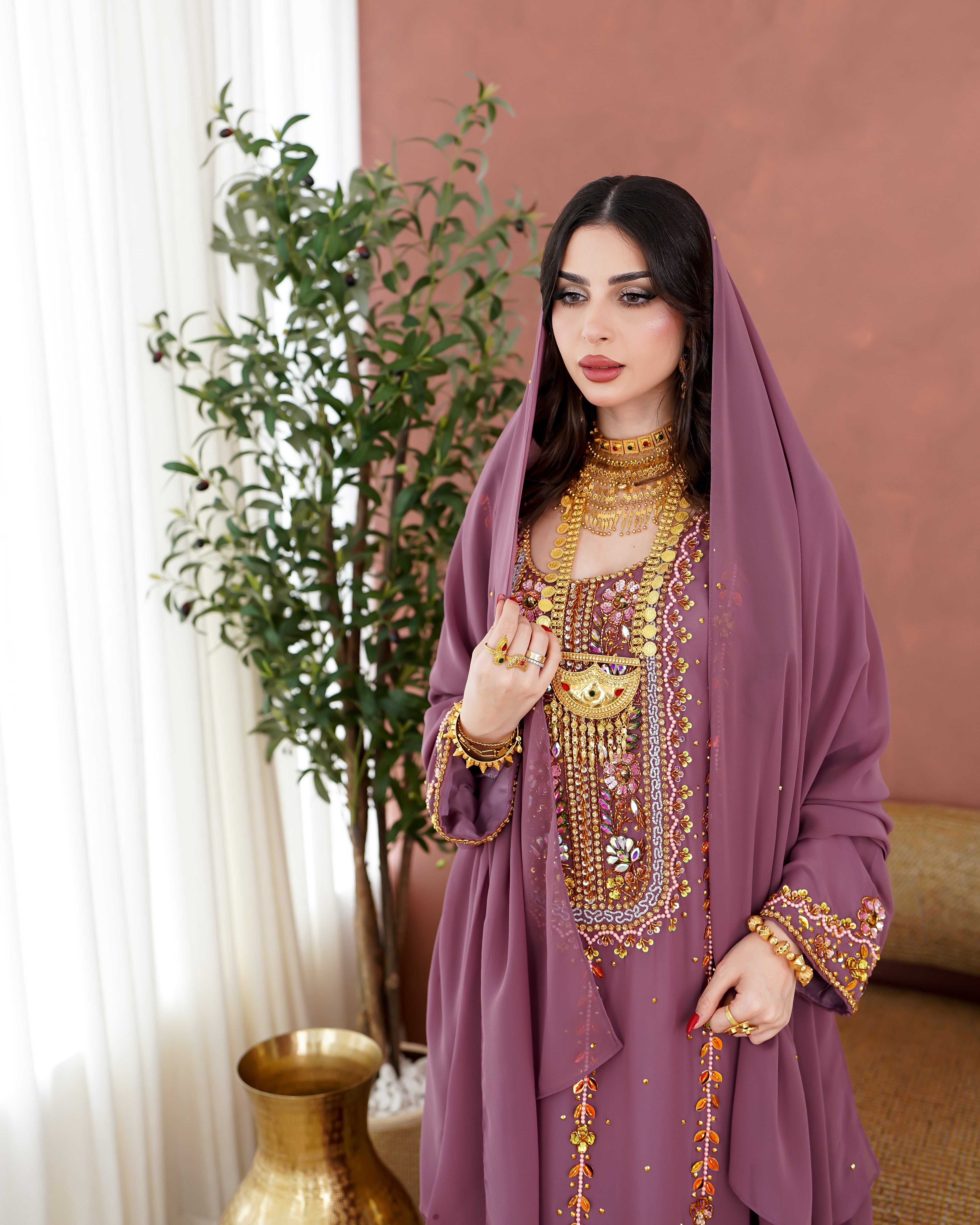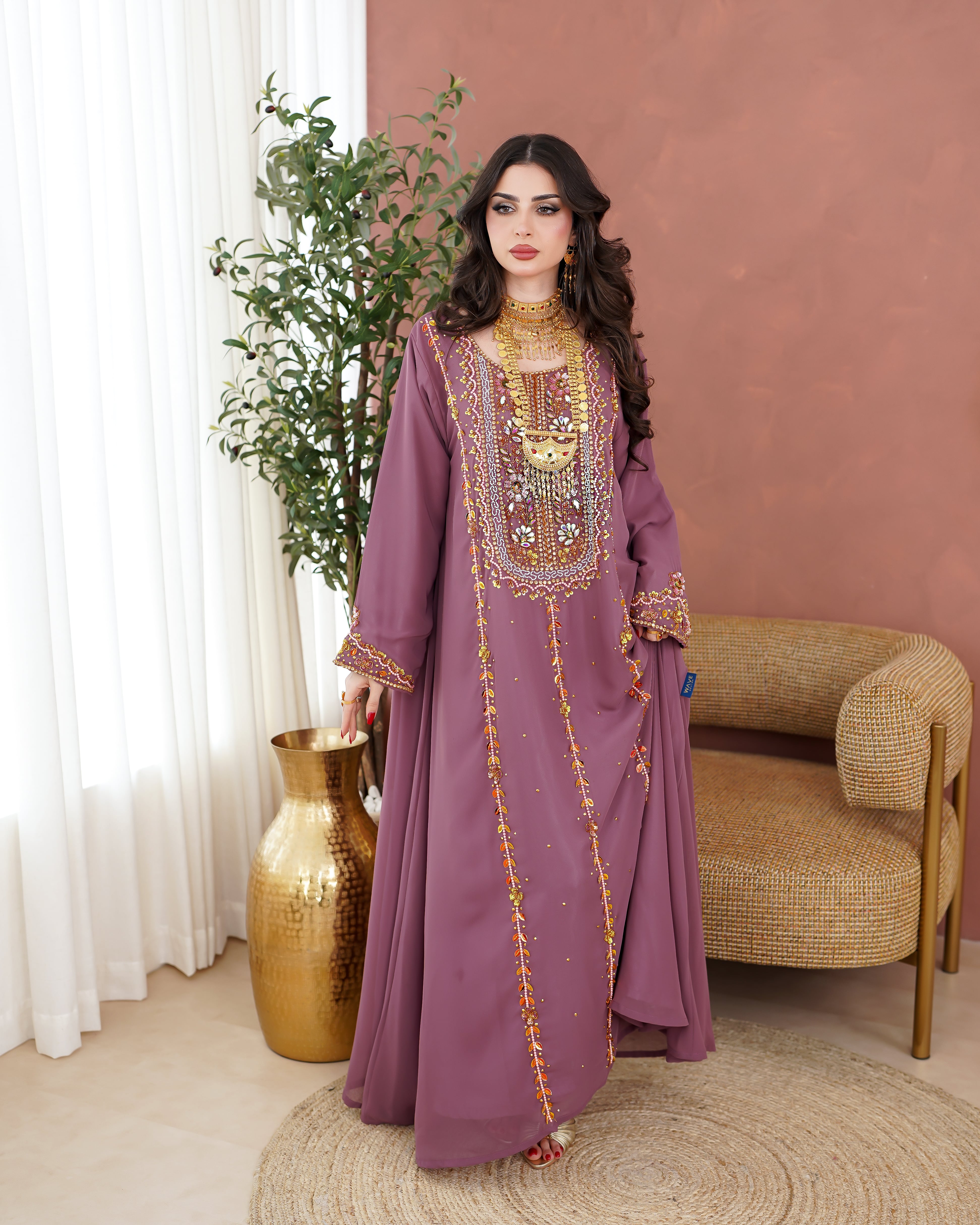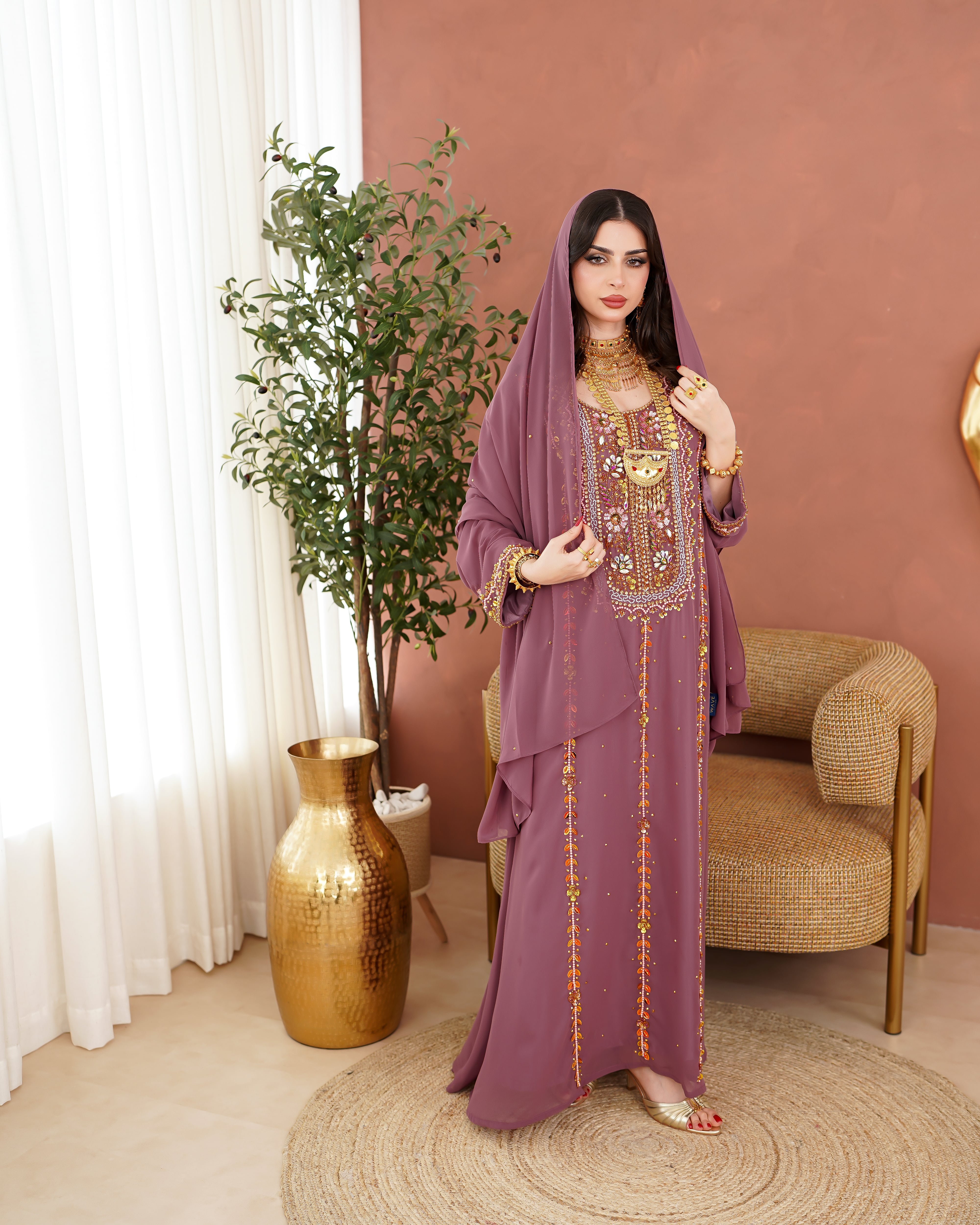 نوع القماش:شيفون شامل الشيلة: نعم ملاحظة: العارضة ترتدي الطول 51 الصدر 28 الكم من نص الرقبة 27