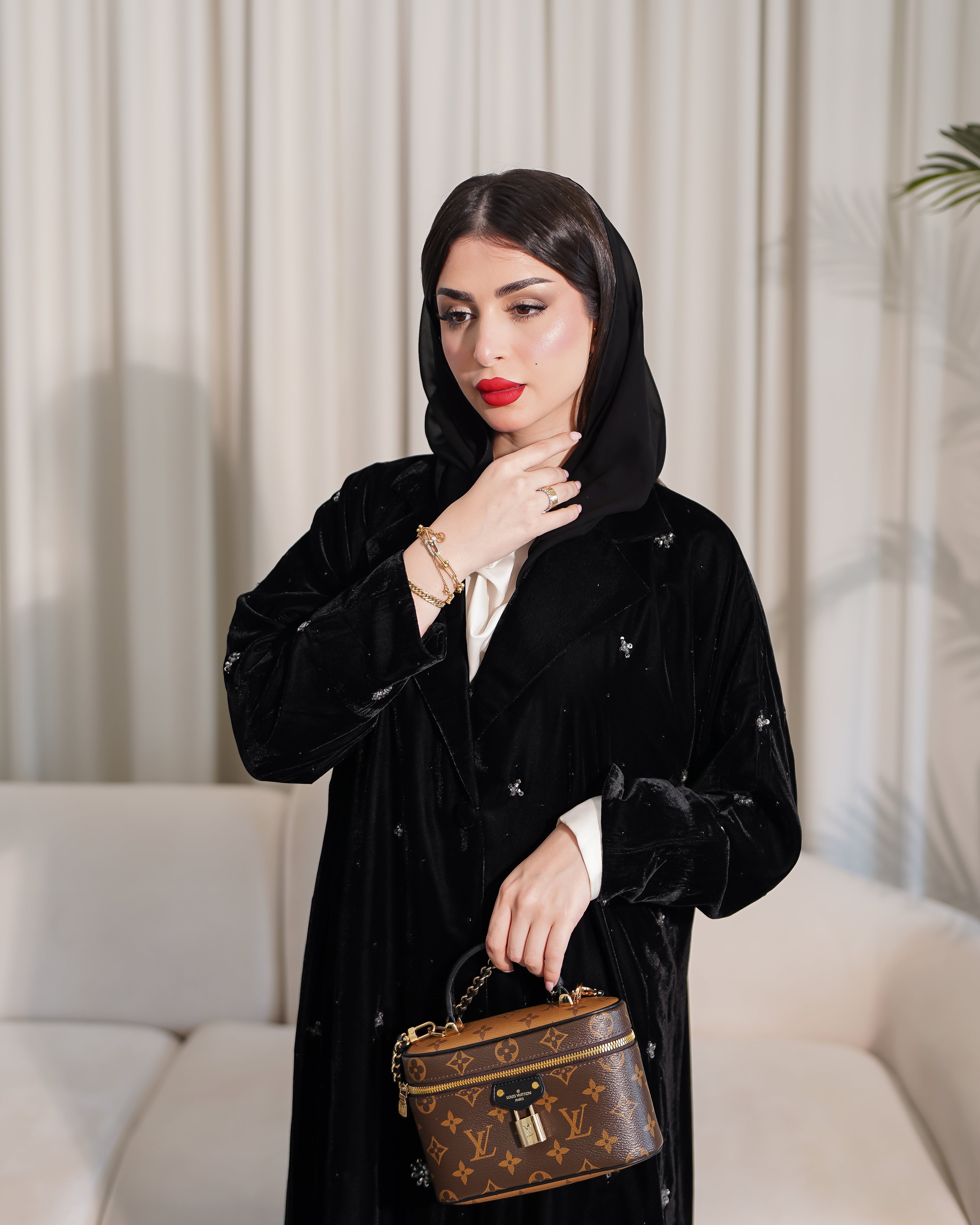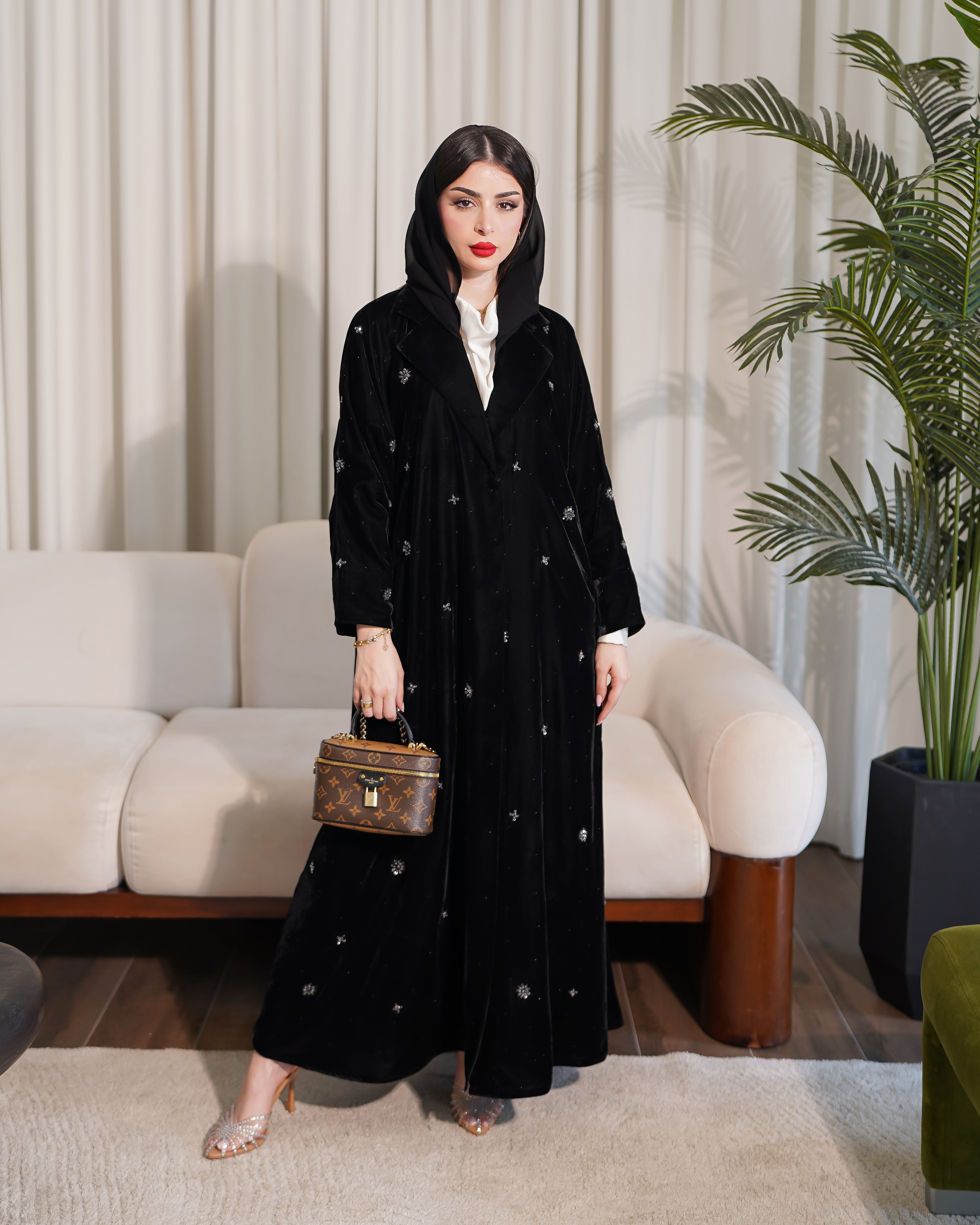نوع القماش: مخمل شامل الشيلة: نعم نوع القصة: نص كلوش ملاحظة: العارضة ترتدي الطول 51 الصدر 28 الكم من نص الرقبة 27