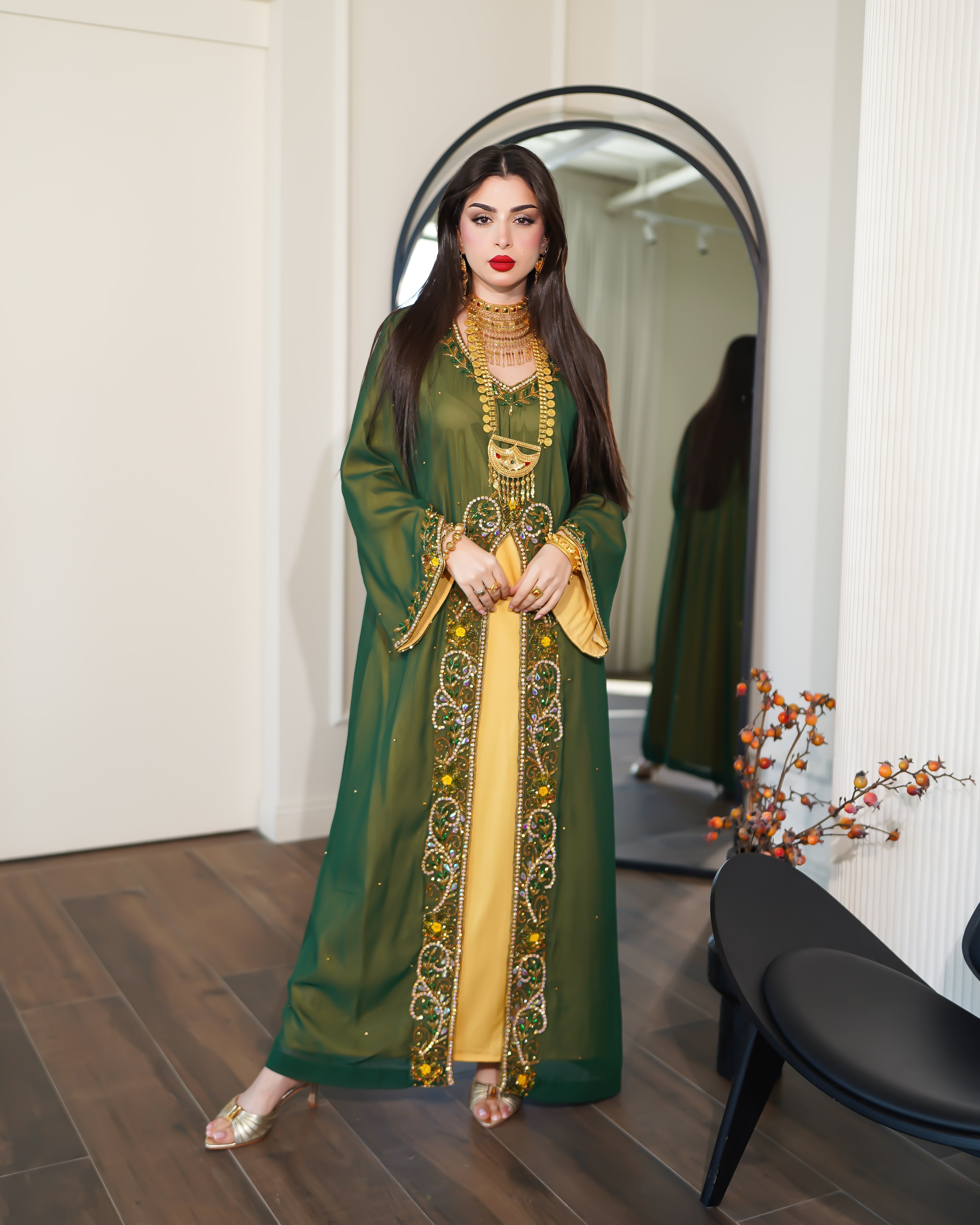 نوع القماش:شيفون شامل الشيلة: نعم ملاحظة: العارضة ترتدي الطول 51 الصدر 28 الكم من نص الرقبة 27