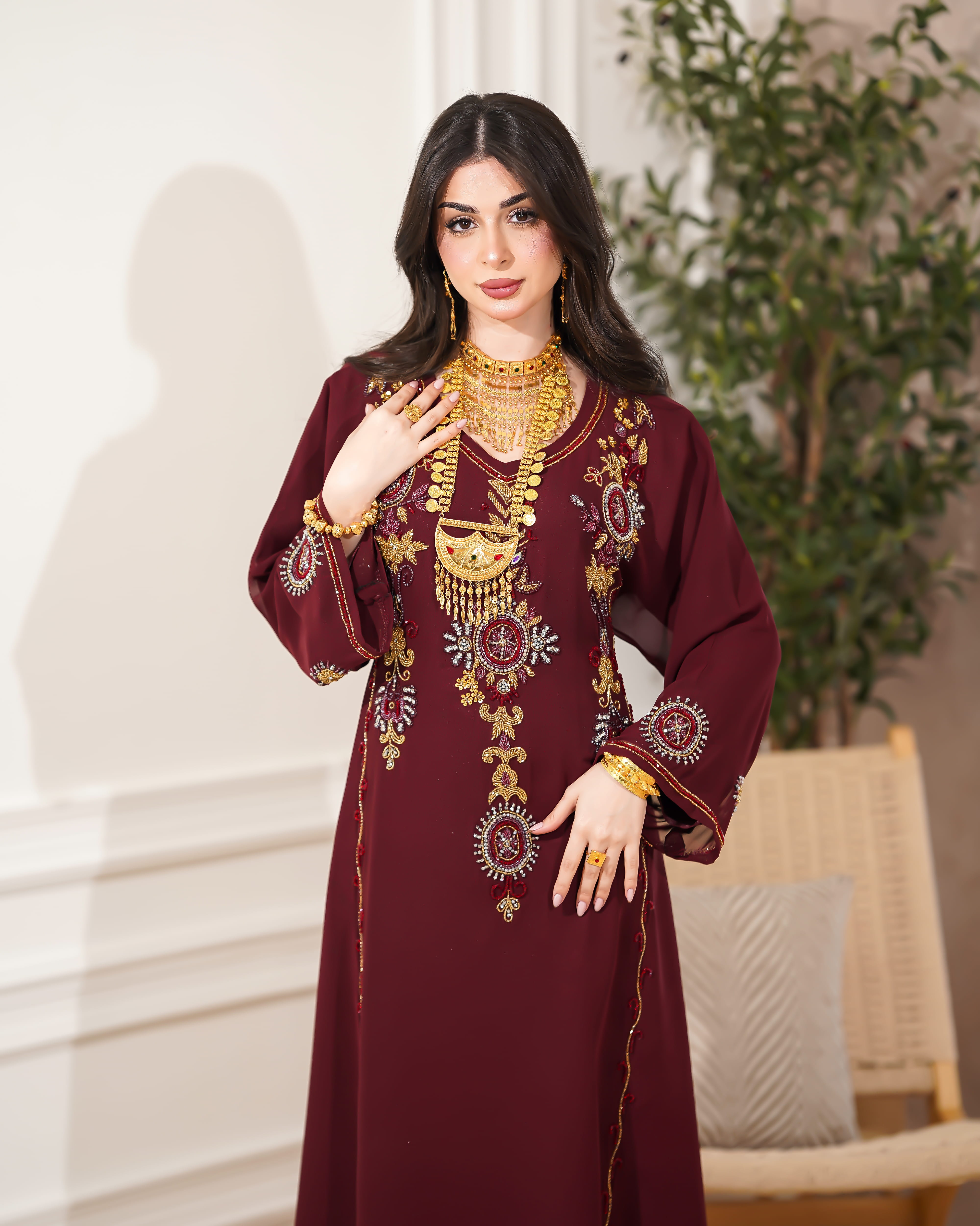 نوع القماش:شيفون شامل الشيلة: نعم ملاحظة: العارضة ترتدي الطول 51 الصدر 28 الكم من نص الرقبة 27