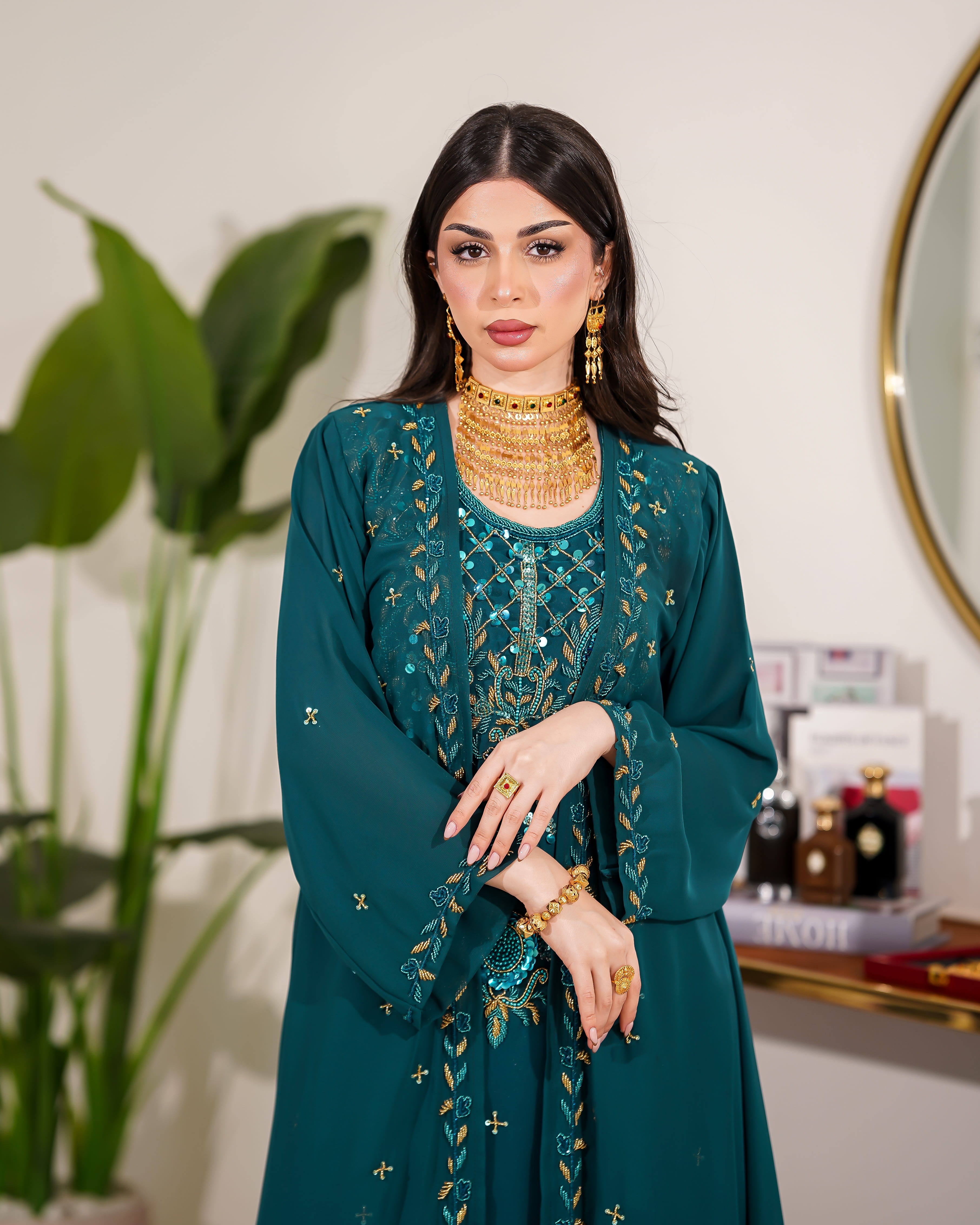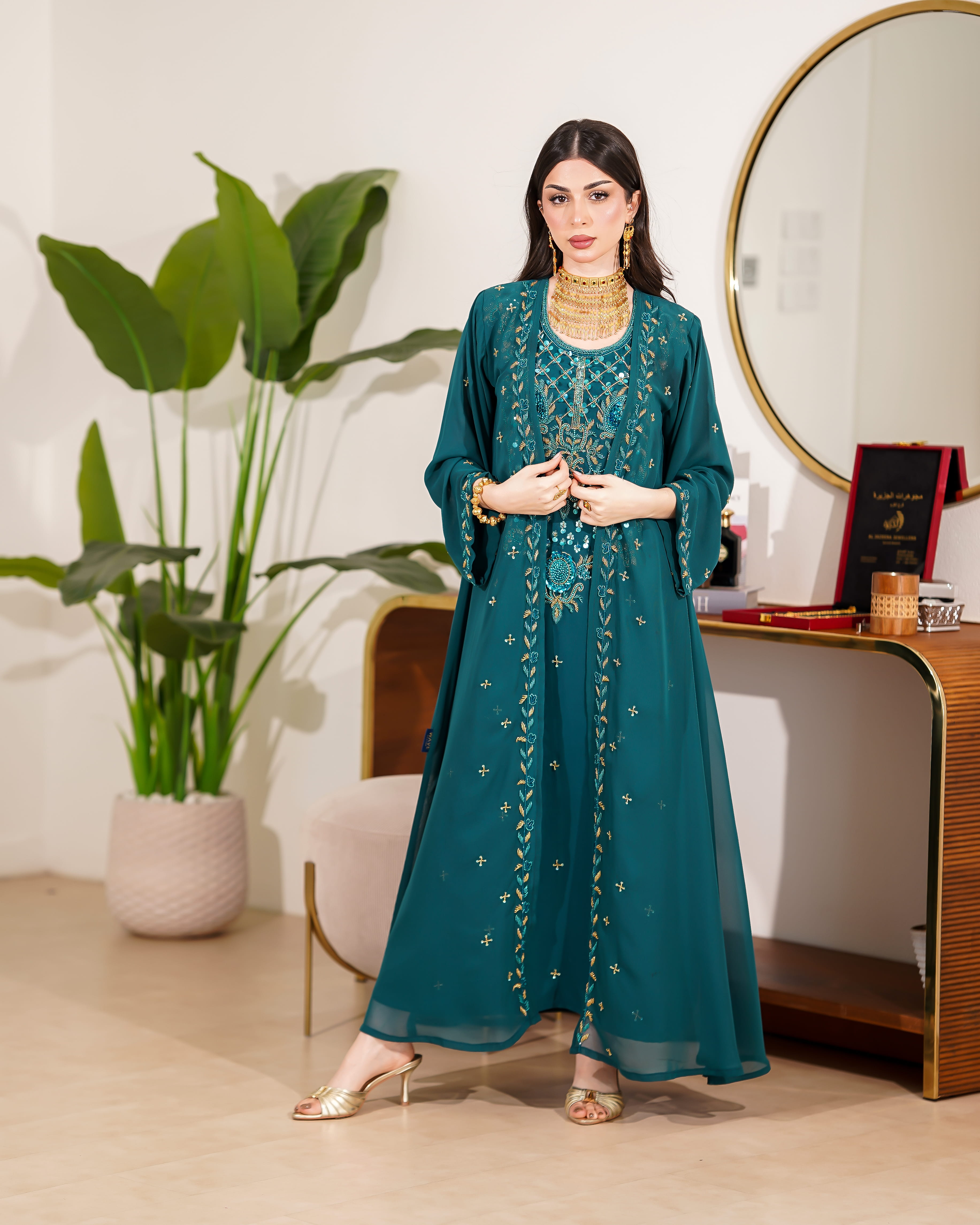 نوع القماش:شيفون شامل الشيلة: نعم ملاحظة: العارضة ترتدي الطول 51 الصدر 28 الكم من نص الرقبة 27