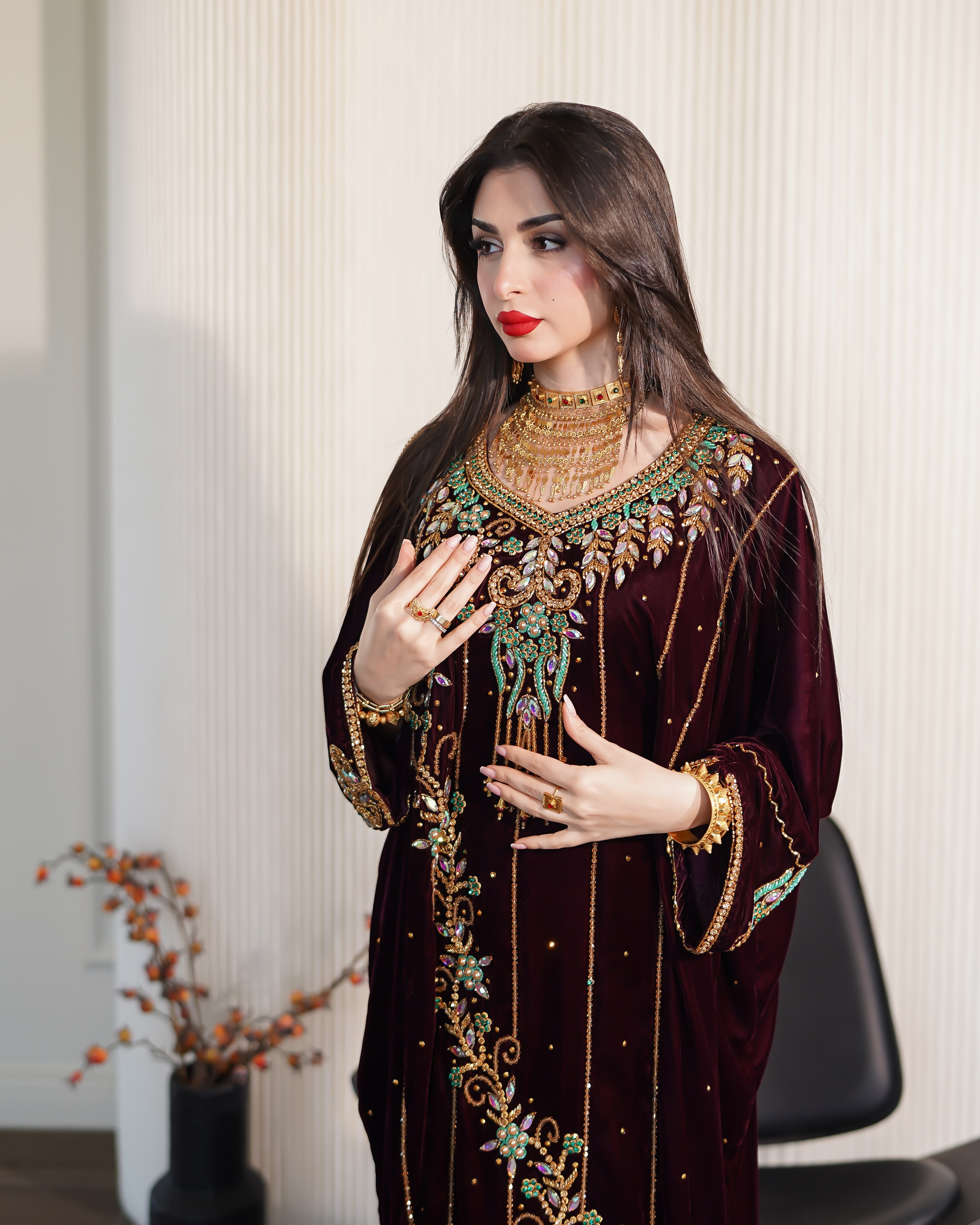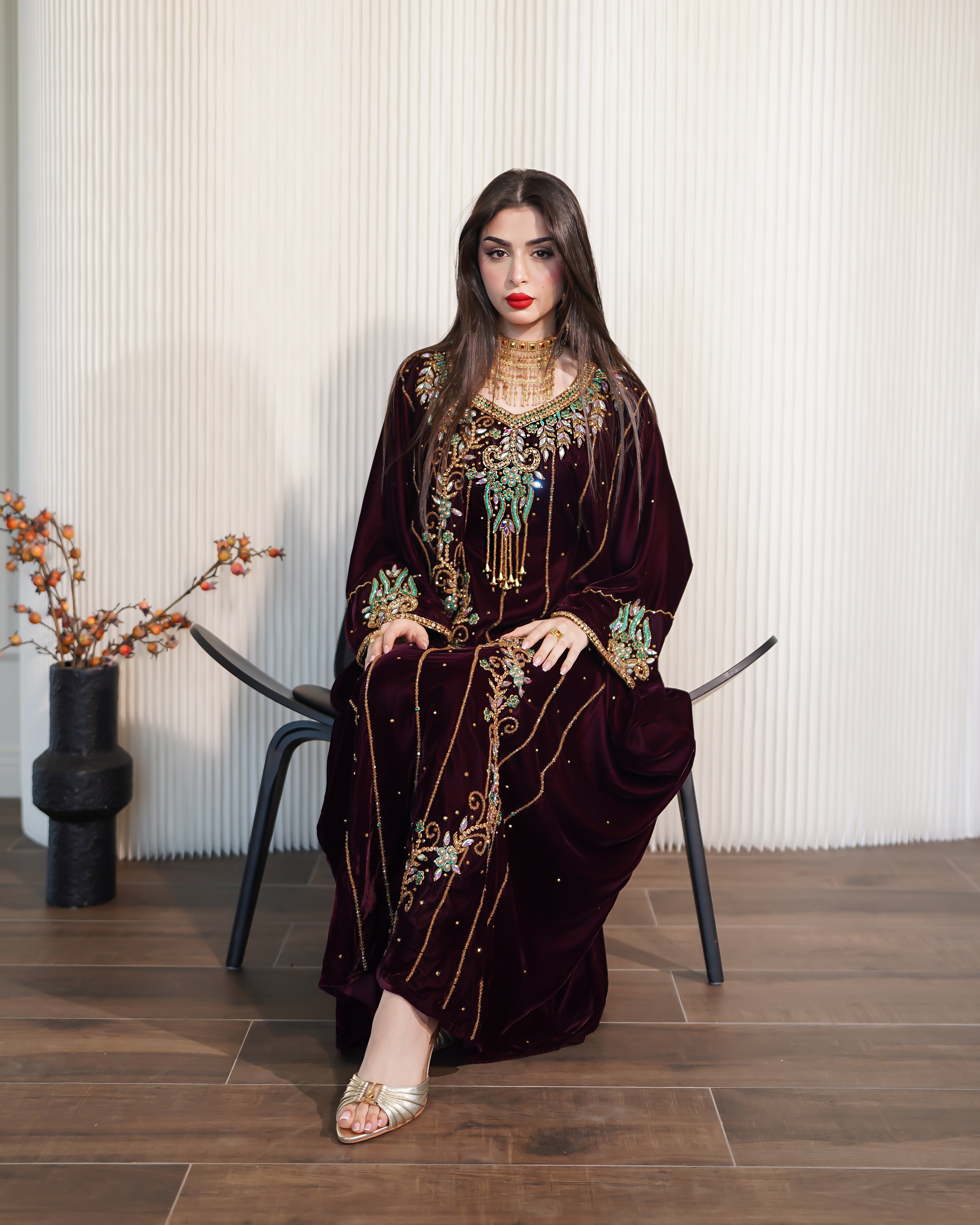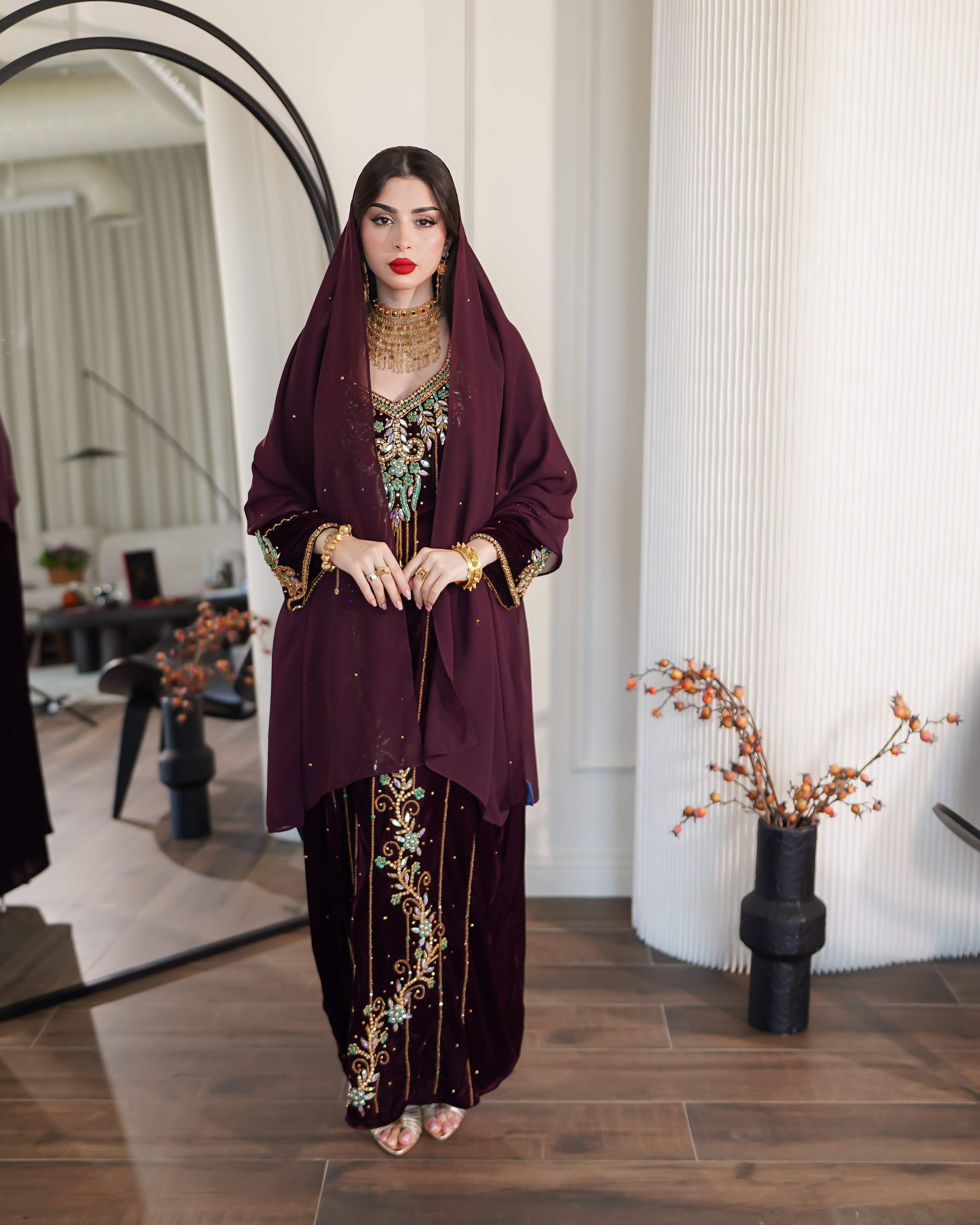 نوع القماش:مخمل شامل الشيلة: نعم ملاحظة: العارضة ترتدي الطول 51 الصدر 28 الكم من نص الرقبة 27