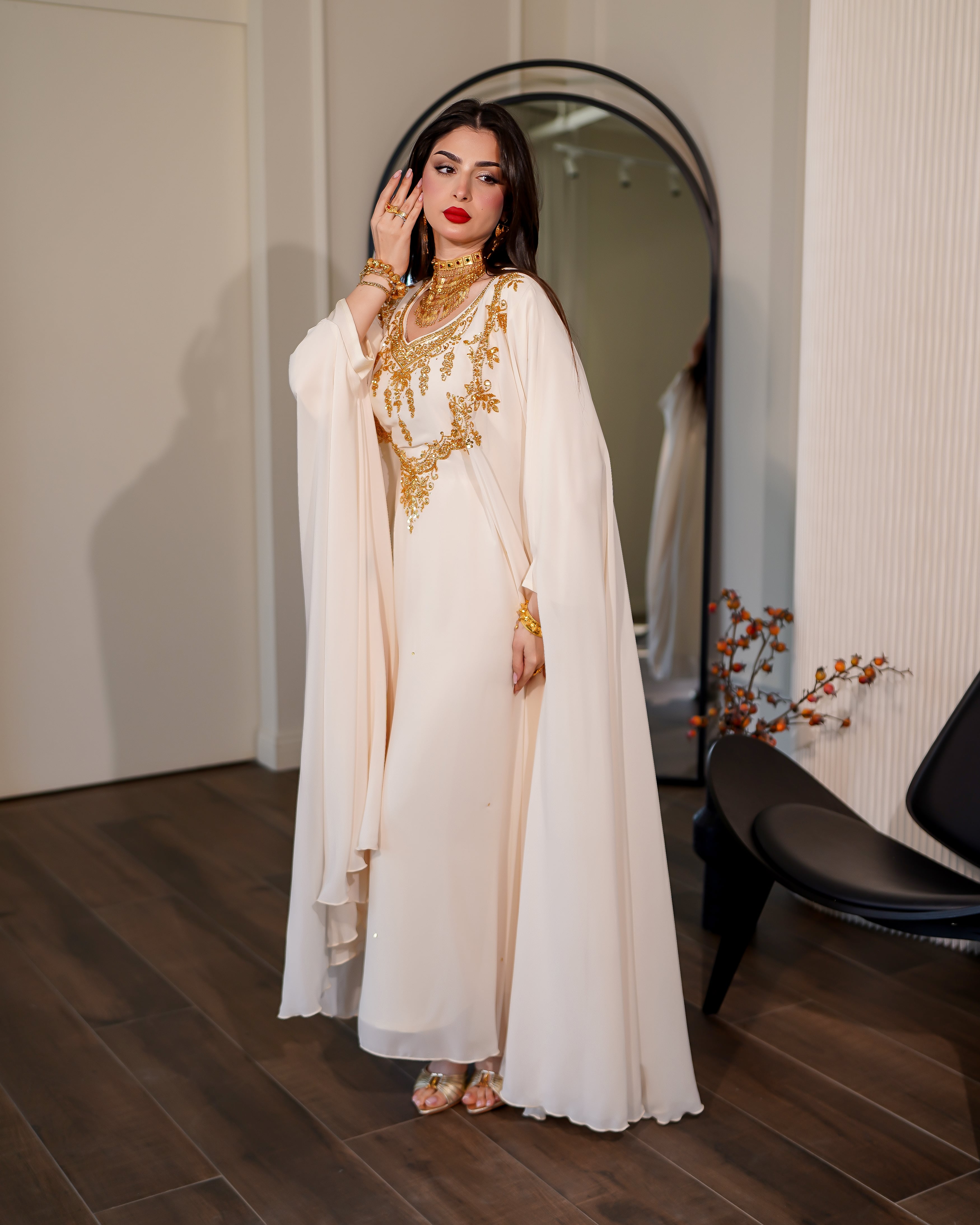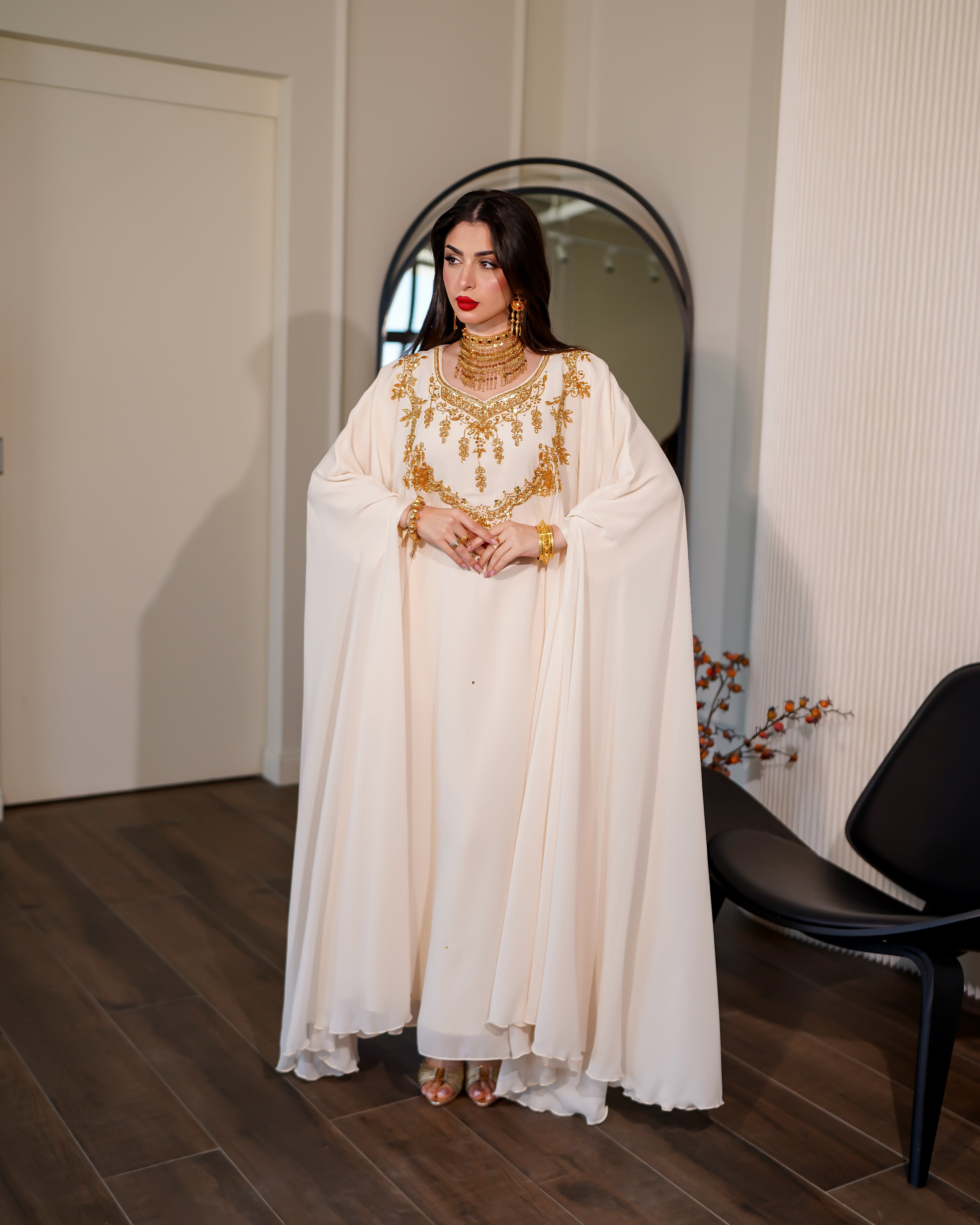 نوع القماش:شيفون شامل الشيلة: نعم ملاحظة: العارضة ترتدي الطول 51 الصدر 28 الكم من نص الرقبة 27