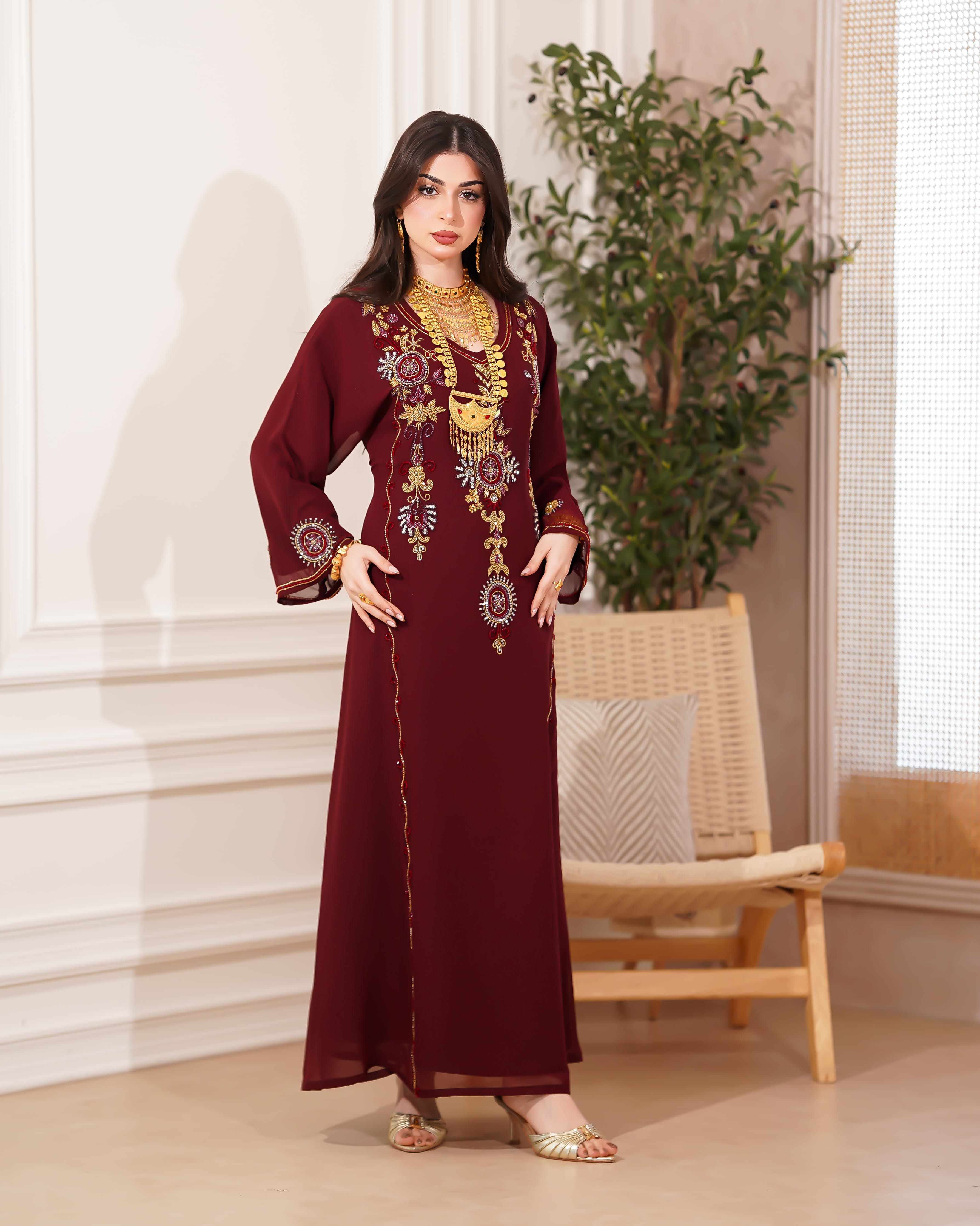 نوع القماش:شيفون شامل الشيلة: نعم ملاحظة: العارضة ترتدي الطول 51 الصدر 28 الكم من نص الرقبة 27