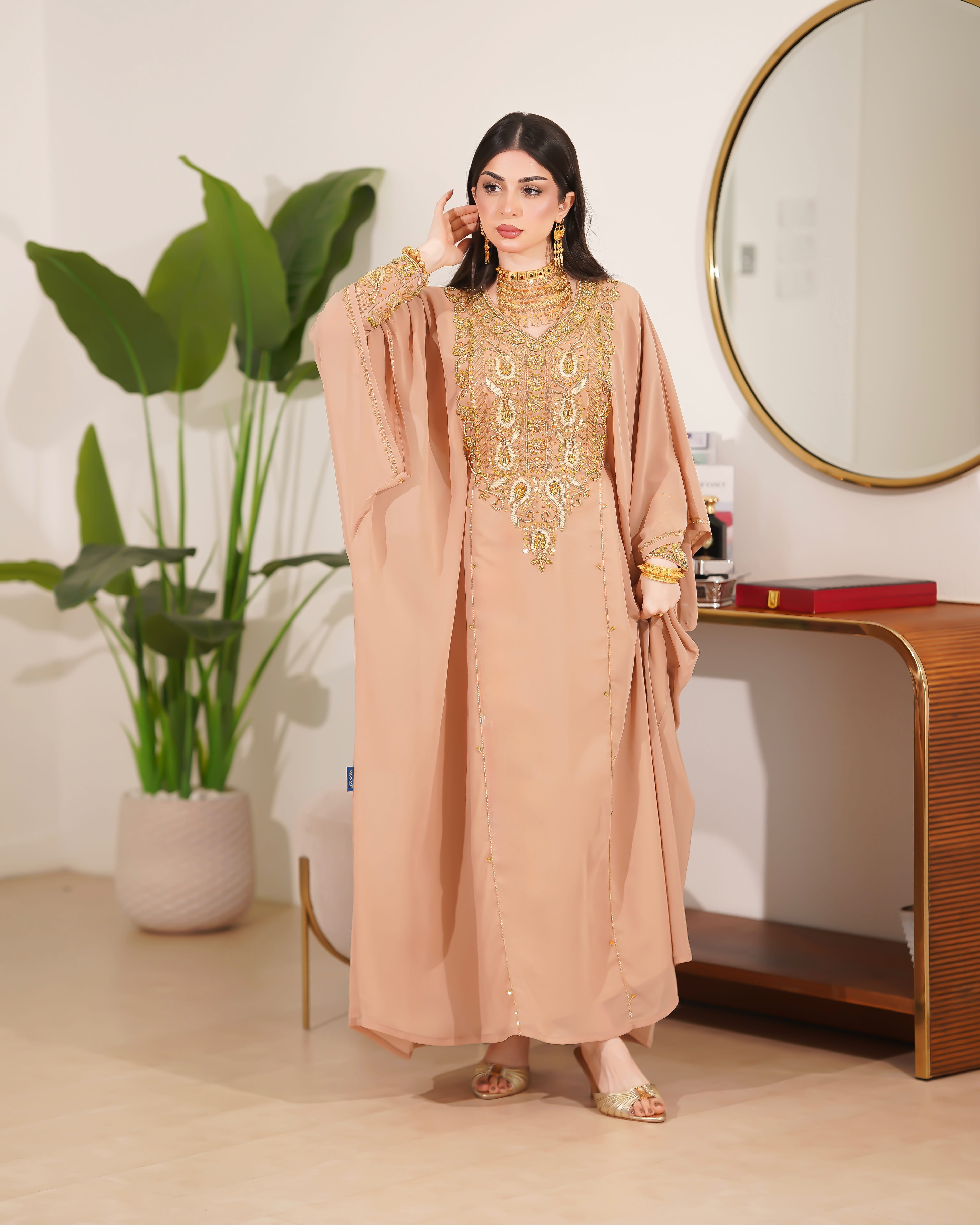 نوع القماش:شيفون شامل الشيلة: نعم ملاحظة: العارضة ترتدي الطول 51 الصدر 28 الكم من نص الرقبة 27